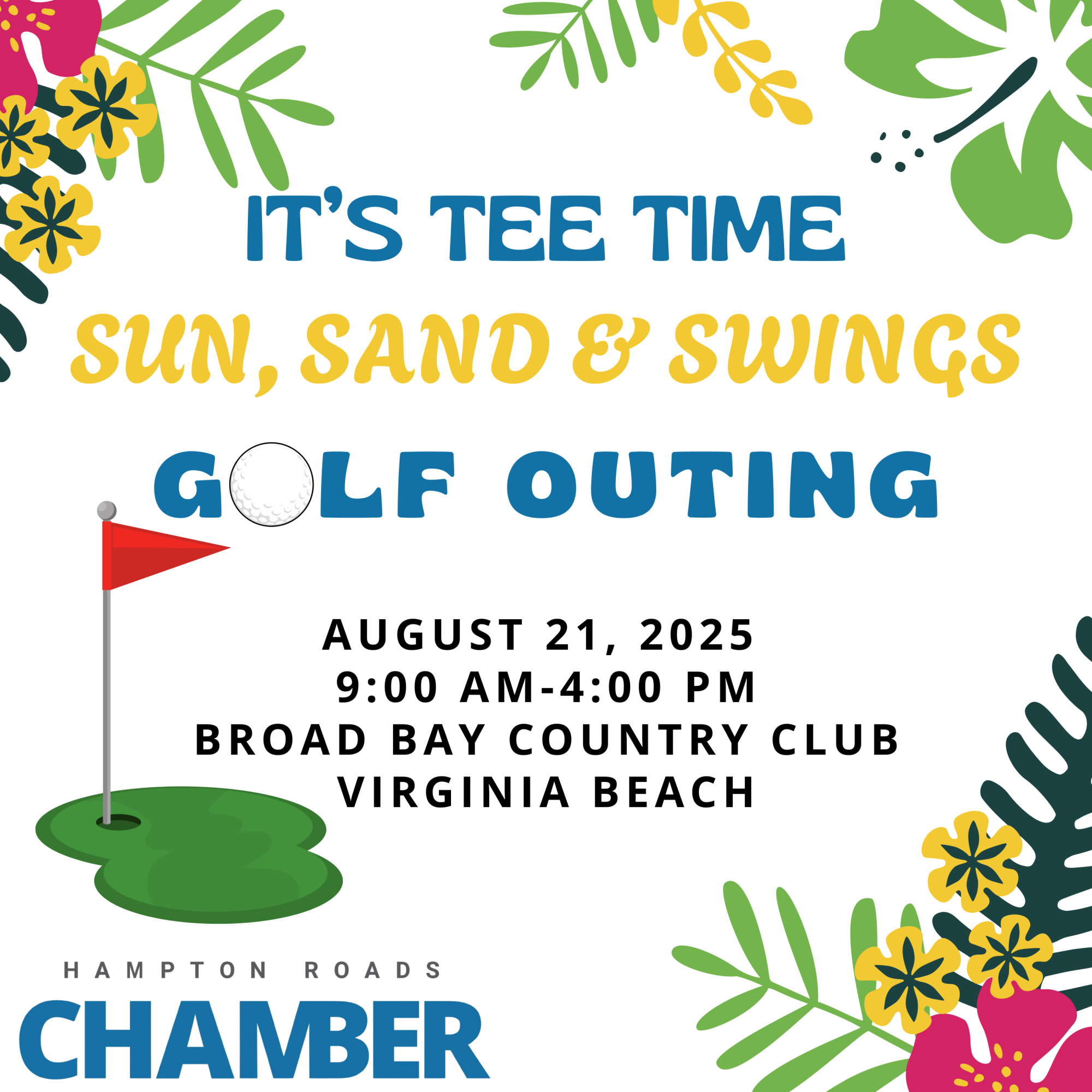 Join the Hampton Roads Chamber for our Sun, Sand & Swings Golf Outing! All levels of play are invited to the biggest par-TEE of the year featuring 18 themed holes of excitement with food, drinks, music, games, freebies, and more. Play with your team or as an individual paired up with new friends, where the only competition you have to worry about is who is having the most fun! This year we are proud to donate all proceeds from the raffle to the Navy Safe Harbor Foundation, benefitting Wounded Warriors.